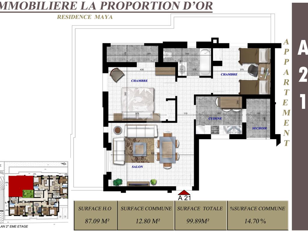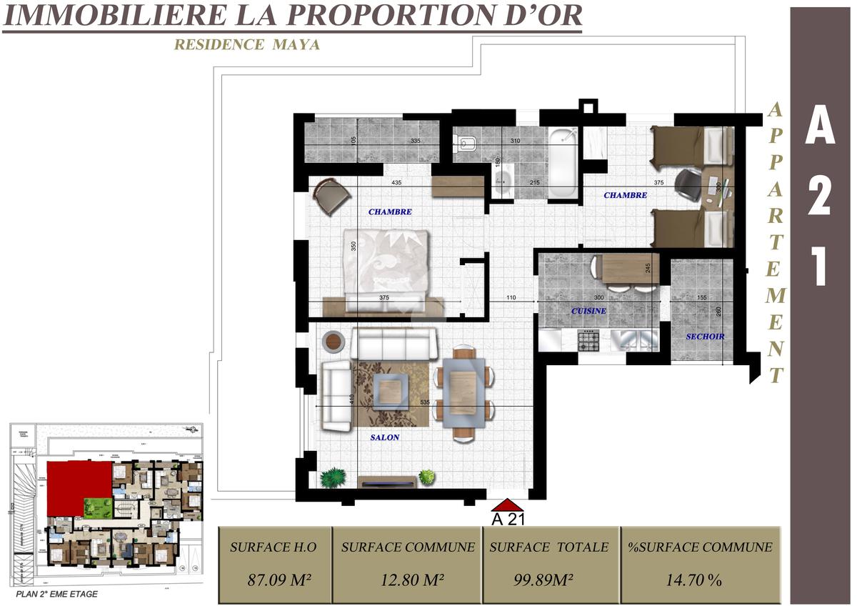 L’appartement, d’une superficie de 99,89 m², se trouve au 2 étage.